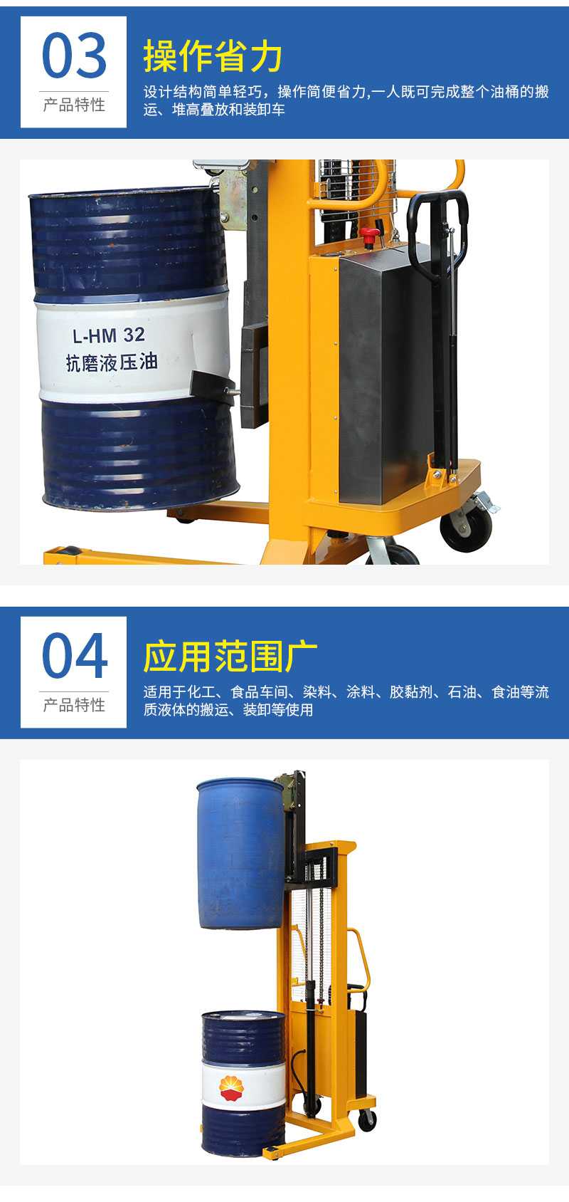 ★電動油桶搬運(yùn)車設(shè)計(jì)結(jié)構(gòu)簡單輕巧,操作簡便省力,一人既可完成整個油桶的搬運(yùn)、堆高疊放和裝卸車。